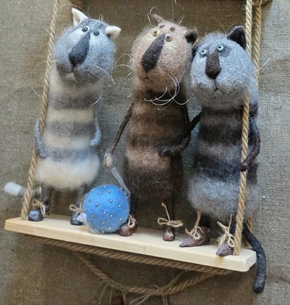 У однієї моєї знайомої в найдальшому кутку кімнати, що на другому поверсі, за старою книжковою шафою на підвісній дерев’яній поличці живуть-поживають троє кумедних повстяних приятелів. Їхня господиня з доброю посмішкою називає цих котів пустунами-витівниками, а може, і розбишаками. Що ж, їй звичайно видніше, адже вона зробила їх сама власноруч. Коти слухняно мовчать, вдаючи, що згодні, хоча насправді вважають трохи інакше. На їхню власну думку ніякі вони не розбишаки-пустуни, а зовсім нешкідливі веселі пустунчики, які іноді, а вірніше – постійно потай затівають усілякі веселі ігри. Але що ж в цьому поганого?! Спитайте хоч у кого – адже, мабуть, усі люблять хоч іноді попустувати. А оскільки приятелів троє, то й пустують вони втричі більше, ніж інші. Проте, звичайно ж, ніяких капостей ці повстяні котики собі не дозволяють – ви тільки подивіться на їхні милі безневинні мордочки, на яких написано саме смирення і послух. Навіть хочеться за це нагородити їх чимось смачненьким… хоча, якщо уважно придивитися, то десь в глибині очей-бусинок можна вловити ледь помітні іскорки прихованої хитрощі, які ні-ні та й поблискують від нетерпіння, немов ось-ось вистрибнуть назовні і затіють яку-небудь чергову витівку.